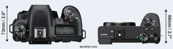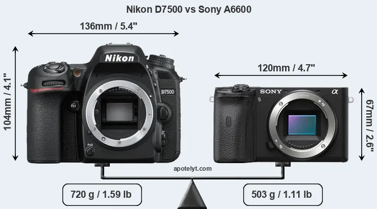 The physical size and weight of the Nikon D7500 and the Sony A6600 are illustrated in the side-by-side display below. The two cameras are presented according to their relative size. Three successive views from the front, the top, and the rear are shown. All width, height and depth measures are rounded to the nearest millimeter.