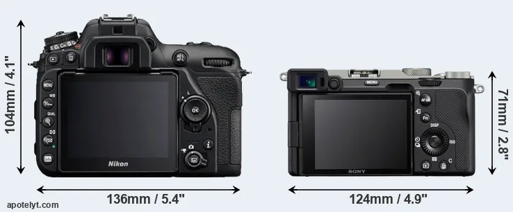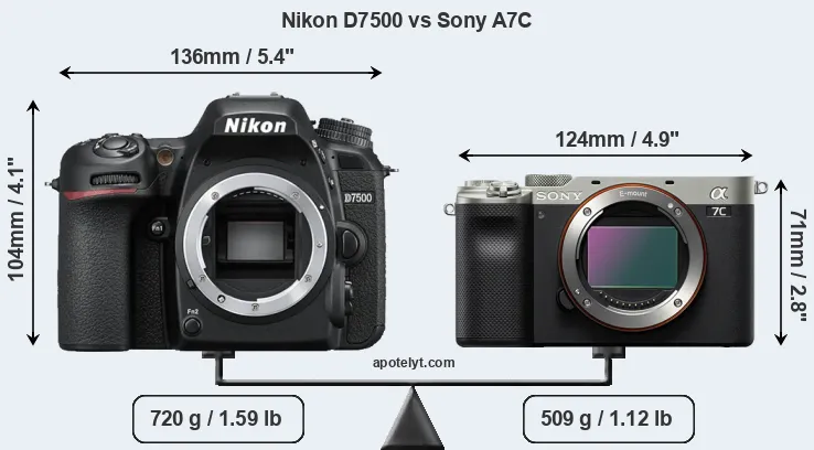 The physical size and weight of the Nikon D7500 and the Sony A7C are illustrated in the side-by-side display below. The two cameras are presented according to their relative size. Three consecutive views from the front, the top, and the rear side are shown. All width, height and depth dimensions are rounded to the nearest millimeter.