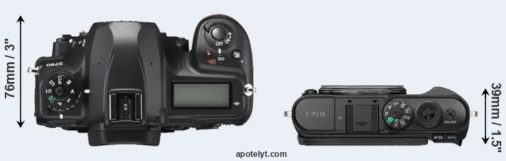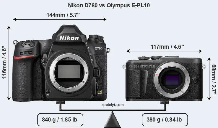 The side-by-side display below illustrates the physical size and weight of the Nikon D780 and the Olympus E-PL10. The two cameras are presented according to their relative size. Three successive views from the front, the top, and the rear are shown. All width, height and depth measures are rounded to the nearest millimeter.