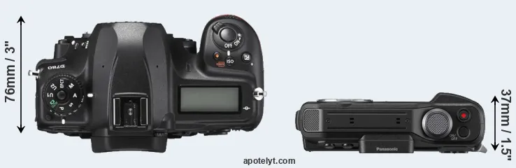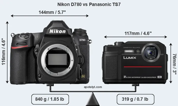 The physical size and weight of the Nikon D780 and the Panasonic TS7 are illustrated in the side-by-side display below. The two cameras are presented according to their relative size. Three successive views from the front, the top, and the rear are shown. All width, height and depth measures are rounded to the nearest millimeter.