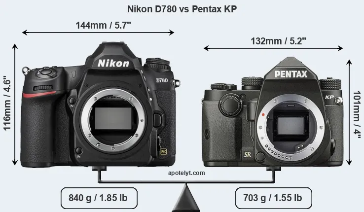The side-by-side display below illustrates the physical size and weight of the Nikon D780 and the Pentax KP. The two cameras are presented according to their relative size. Three successive views from the front, the top, and the rear are shown. All size dimensions are rounded to the nearest millimeter.