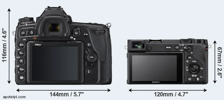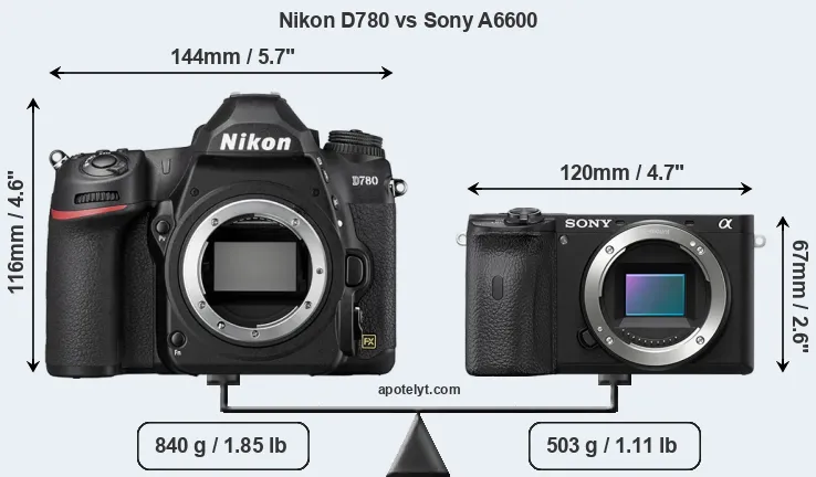 The side-by-side display below illustrates the physical size and weight of the Nikon D780 and the Sony A6600. The two cameras are presented according to their relative size. Three successive views from the front, the top, and the rear are shown. All width, height and depth dimensions are rounded to the nearest millimeter.