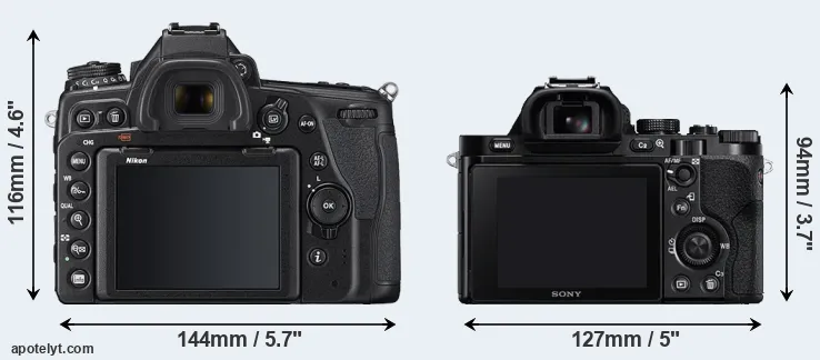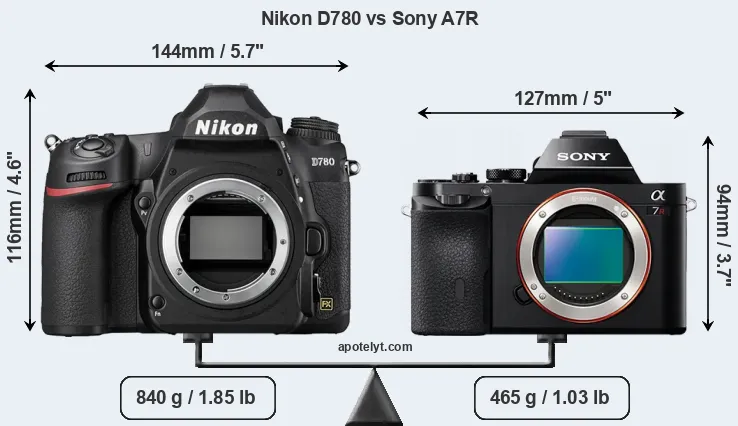 The side-by-side display below illustrates the physical size and weight of the Nikon D780 and the Sony A7R. The two cameras are presented according to their relative size. Three successive views from the front, the top, and the rear are shown. All size dimensions are rounded to the nearest millimeter.