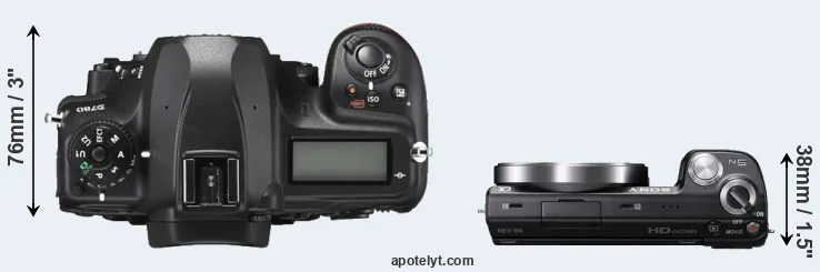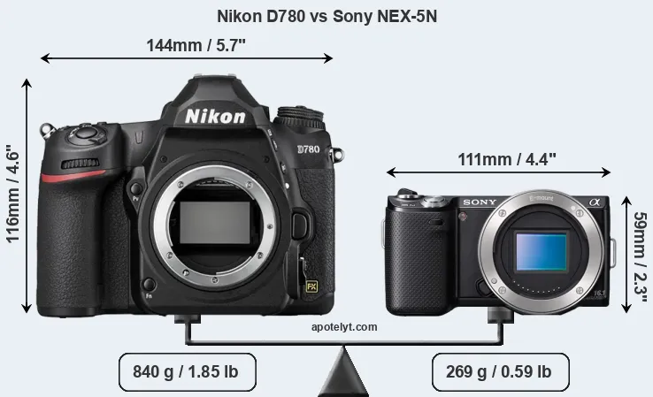 The side-by-side display below illustrates the physical size and weight of the Nikon D780 and the Sony NEX-5N. The two cameras are presented according to their relative size. Three consecutive views from the front, the top, and the rear side are shown. All size dimensions are rounded to the nearest millimeter.