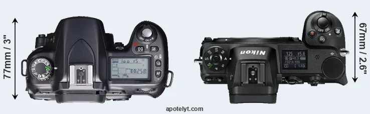 If the front view area (width x height) of the cameras is taken as an aggregate measure of their size, the Nikon D80 and the Nikon Z6 are of equal size. However, the Z6 is slightly heavier (1 percent) than the D80. It is noteworthy in this context that the Z6 is splash and dust-proof, while the D80 does not feature any corresponding weather-sealing.