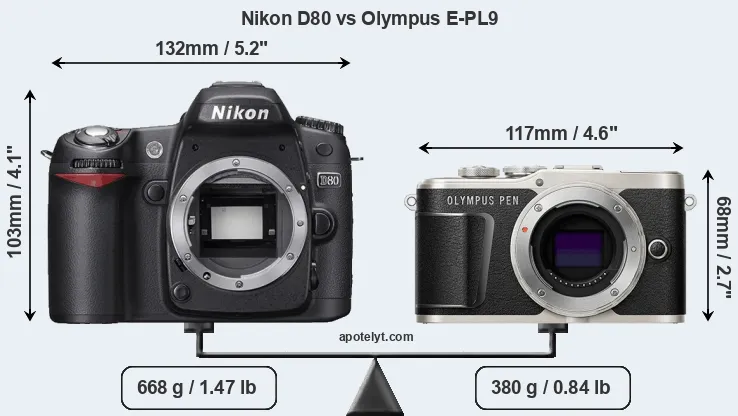If the front view area (width x height) of the cameras is taken as an aggregate measure of their size, the Olympus E-PL9 is considerably smaller (41 percent) than the Nikon D80. Moreover, the E-PL9 is substantially lighter (43 percent) than the D80. In this context, it is worth noting that neither the D80 nor the E-PL9 are weather-sealed.