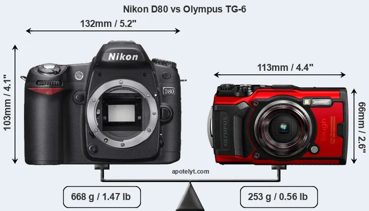 Going beyond this snapshot of core features and characteristics, what are the differences between the Nikon D80 and the Olympus Tough TG-6? Which one should you buy? Read on to find out how these two cameras compare with respect to their body size, their imaging sensors, their shooting features, their input-output connections, and their reception by expert reviewers.