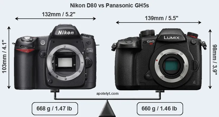 The physical size and weight of the Nikon D80 and the Panasonic GH5s are illustrated in the side-by-side display below. The two cameras are presented according to their relative size. Three consecutive perspectives from the front, the top, and the back are available. All width, height and depth measures are rounded to the nearest millimeter.