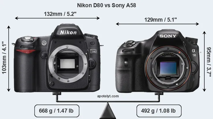 An illustration of the physical size and weight of the Nikon D80 and the Sony A58 is provided in the side-by-side display below. The two cameras are presented according to their relative size. Three consecutive views from the front, the top, and the rear side are shown. All width, height and depth measures are rounded to the nearest millimeter.