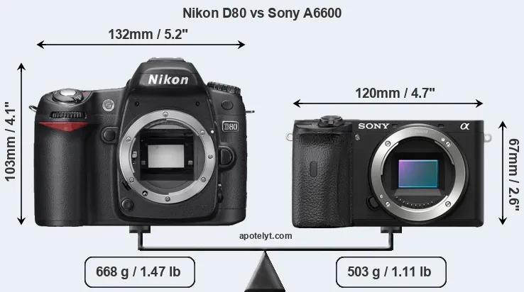 If the front view area (width x height) of the cameras is taken as an aggregate measure of their size, the Sony A6600 is considerably smaller (41 percent) than the Nikon D80. Moreover, the A6600 is markedly lighter (25 percent) than the D80. It is noteworthy in this context that the A6600 is splash and dust-proof, while the D80 does not feature any corresponding weather-sealing.