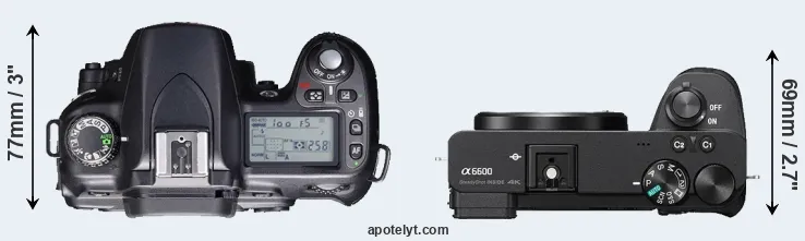 The side-by-side display below illustrates the physical size and weight of the Nikon D80 and the Sony A6600. The two cameras are presented according to their relative size. Three consecutive views from the front, the top, and the rear side are shown. All size dimensions are rounded to the nearest millimeter.
