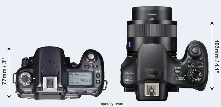 The side-by-side display below illustrates the physical size and weight of the Nikon D80 and the Sony HX400V. The two cameras are presented according to their relative size. Three consecutive perspectives from the front, the top, and the back are available. All width, height and depth dimensions are rounded to the nearest millimeter.
