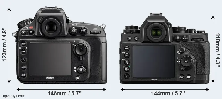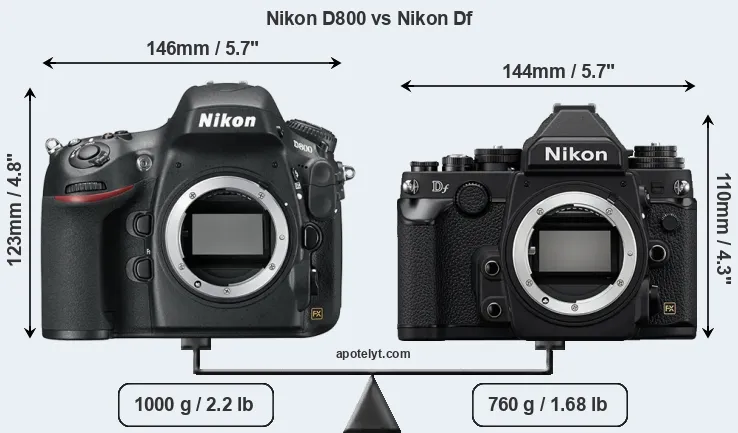 The physical size and weight of the Nikon D800 and the Nikon Df are illustrated in the side-by-side display below. The two cameras are presented according to their relative size. Three consecutive perspectives from the front, the top, and the back are available. All width, height and depth dimensions are rounded to the nearest millimeter.