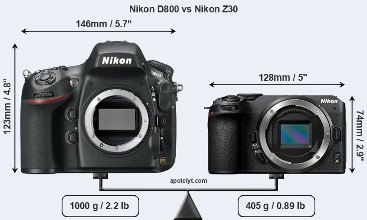 The physical size and weight of the Nikon D800 and the Nikon Z30 are illustrated in the side-by-side display below. The two cameras are presented according to their relative size. Three consecutive views from the front, the top, and the rear side are shown. All width, height and depth dimensions are rounded to the nearest millimeter.