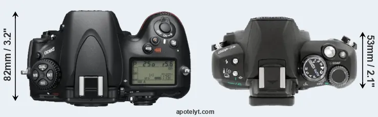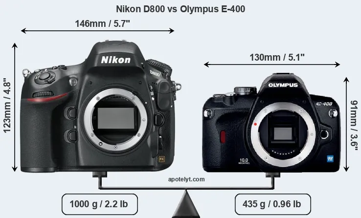 An illustration of the physical size and weight of the Nikon D800 and the Olympus E-400 is provided in the side-by-side display below. The two cameras are presented according to their relative size. Three consecutive perspectives from the front, the top, and the back are available. All size dimensions are rounded to the nearest millimeter.