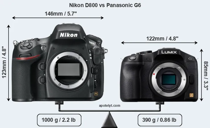 An illustration of the physical size and weight of the Nikon D800 and the Panasonic G6 is provided in the side-by-side display below. The two cameras are presented according to their relative size. Three consecutive perspectives from the front, the top, and the back are available. All width, height and depth dimensions are rounded to the nearest millimeter.