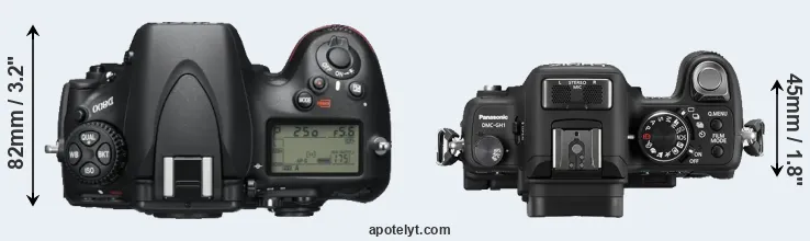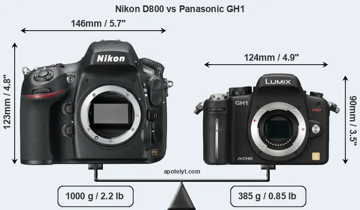 The physical size and weight of the Nikon D800 and the Panasonic GH1 are illustrated in the side-by-side display below. The two cameras are presented according to their relative size. Three successive views from the front, the top, and the rear are shown. All width, height and depth dimensions are rounded to the nearest millimeter.