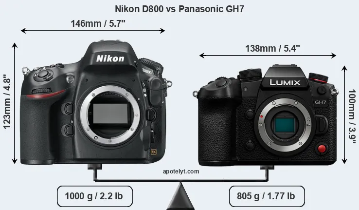 The side-by-side display below illustrates the physical size and weight of the Nikon D800 and the Panasonic GH7. The two cameras are presented according to their relative size. Three consecutive perspectives from the front, the top, and the back are available. All width, height and depth measures are rounded to the nearest millimeter.