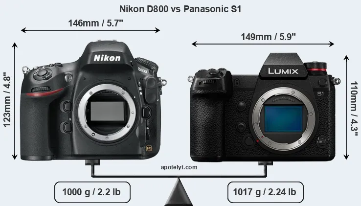 An illustration of the physical size and weight of the Nikon D800 and the Panasonic S1 is provided in the side-by-side display below. The two cameras are presented according to their relative size. Three consecutive views from the front, the top, and the rear side are shown. All width, height and depth measures are rounded to the nearest millimeter.
