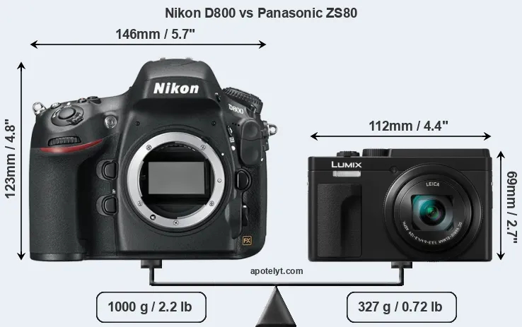 An illustration of the physical size and weight of the Nikon D800 and the Panasonic ZS80 is provided in the side-by-side display below. The two cameras are presented according to their relative size. Three successive views from the front, the top, and the rear are shown. All width, height and depth dimensions are rounded to the nearest millimeter.