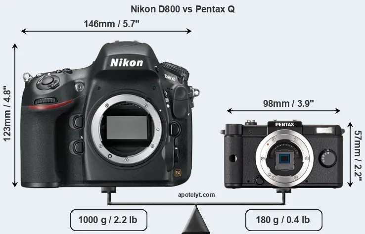 If the front view area (width x height) of the cameras is taken as an aggregate measure of their size, the Pentax Q is considerably smaller (69 percent) than the Nikon D800. Moreover, the Pentax Q is substantially lighter (82 percent) than the D800. It is worth mentioning in this context that the D800 is splash and dust resistant, while the Pentax Q does not feature any corresponding weather-sealing.