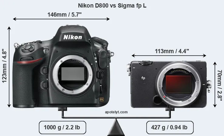 An illustration of the physical size and weight of the Nikon D800 and the Sigma fp L is provided in the side-by-side display below. The two cameras are presented according to their relative size. Three consecutive perspectives from the front, the top, and the back are available. All size dimensions are rounded to the nearest millimeter.