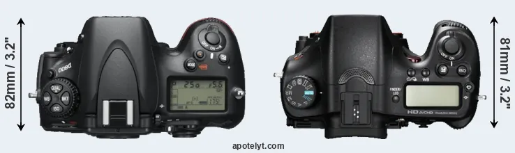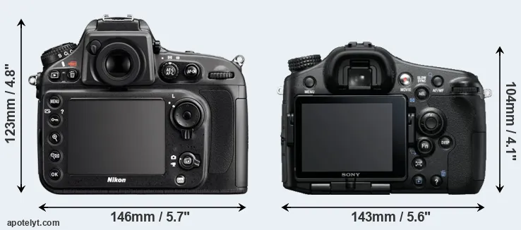 The side-by-side display below illustrates the physical size and weight of the Nikon D800 and the Sony A77. The two cameras are presented according to their relative size. Three consecutive views from the front, the top, and the rear side are shown. All size dimensions are rounded to the nearest millimeter.