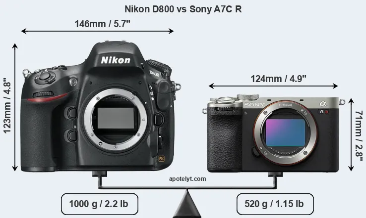 The above size and weight comparisons are to some extent incomplete since they do not consider the interchangeable lenses that both of these cameras require. Both cameras have similarly sized sensors, but DSLRs have a larger flange-to-focal plane distance than mirrorless cameras, which imposes contraints on the optical engineering process and generally leads to bigger and heavier lenses. You can compare the optics available for the two cameras in the Nikon Lens Catalog (D800) and the Sony FE Lens Catalog (A7C R). Mirrorless cameras, such as the A7C R, have moreover the advantage that they can use many lenses from other systems via adapters, as they have a relatively short flange to focal plane distance.