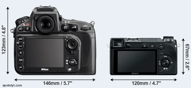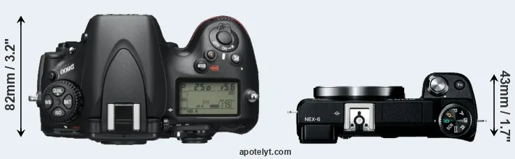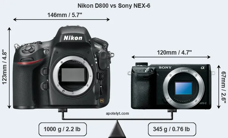 The side-by-side display below illustrates the physical size and weight of the Nikon D800 and the Sony NEX-6. The two cameras are presented according to their relative size. Three consecutive views from the front, the top, and the rear side are shown. All width, height and depth measures are rounded to the nearest millimeter.