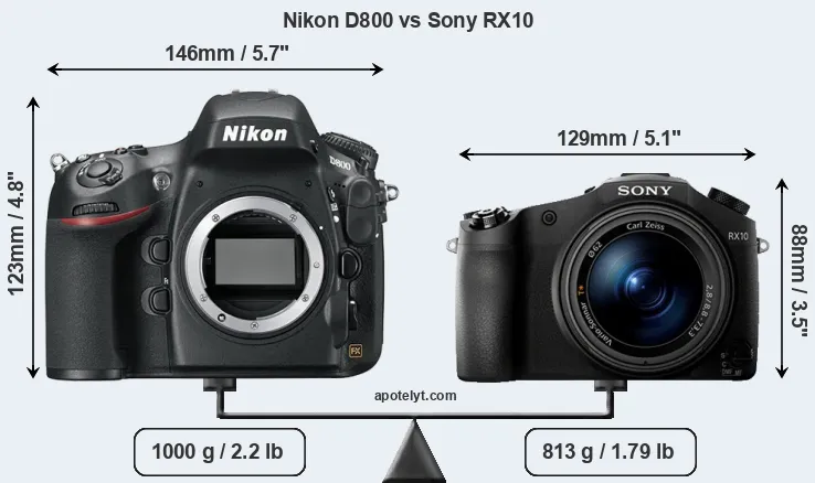 An illustration of the physical size and weight of the Nikon D800 and the Sony RX10 is provided in the side-by-side display below. The two cameras are presented according to their relative size. Three consecutive views from the front, the top, and the rear side are shown. All width, height and depth measures are rounded to the nearest millimeter.