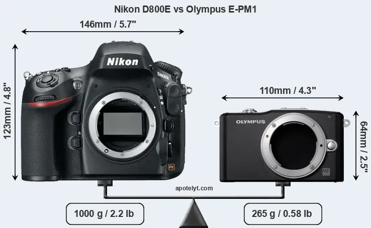 The side-by-side display below illustrates the physical size and weight of the Nikon D800E and the Olympus E-PM1. The two cameras are presented according to their relative size. Three consecutive perspectives from the front, the top, and the back are available. All width, height and depth measures are rounded to the nearest millimeter.
