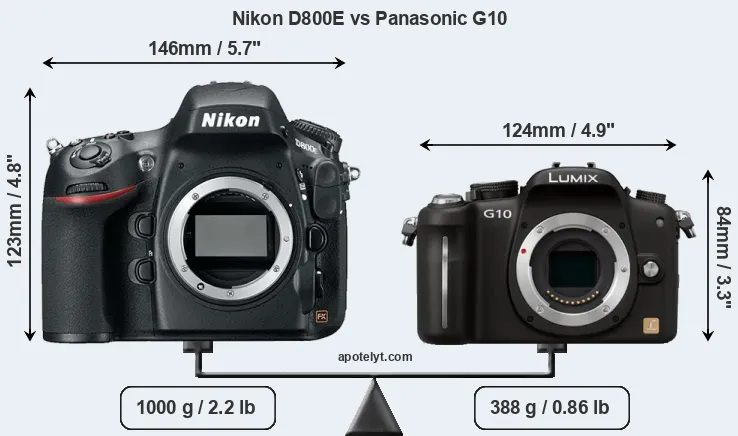 If the front view area (width x height) of the cameras is taken as an aggregate measure of their size, the Panasonic G10 is considerably smaller (42 percent) than the Nikon D800E. Moreover, the G10 is substantially lighter (61 percent) than the D800E. It is worth mentioning in this context that the D800E is splash and dust resistant, while the G10 does not feature any corresponding weather-sealing.