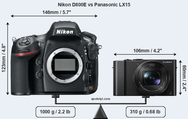 An illustration of the physical size and weight of the Nikon D800E and the Panasonic LX15 is provided in the side-by-side display below. The two cameras are presented according to their relative size. Three consecutive perspectives from the front, the top, and the back are available. All size dimensions are rounded to the nearest millimeter.