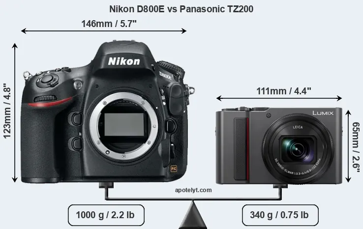An illustration of the physical size and weight of the Nikon D800E and the Panasonic TZ200 is provided in the side-by-side display below. The two cameras are presented according to their relative size. Three successive views from the front, the top, and the rear are shown. All size dimensions are rounded to the nearest millimeter.