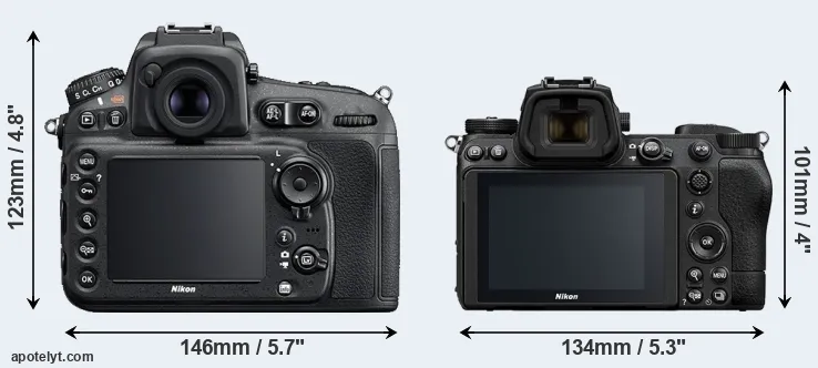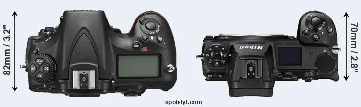 The side-by-side display below illustrates the physical size and weight of the Nikon D810 and the Nikon Z6 II. The two cameras are presented according to their relative size. Three consecutive views from the front, the top, and the rear side are shown. All width, height and depth measures are rounded to the nearest millimeter.