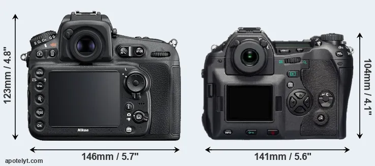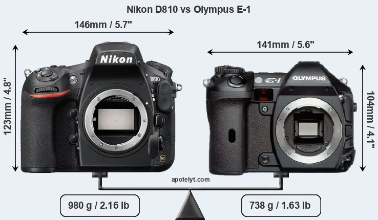 The side-by-side display below illustrates the physical size and weight of the Nikon D810 and the Olympus E-1. The two cameras are presented according to their relative size. Three consecutive perspectives from the front, the top, and the back are available. All width, height and depth measures are rounded to the nearest millimeter.