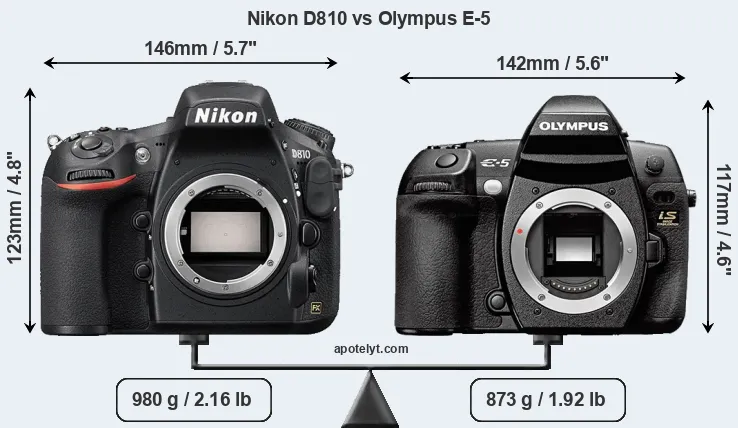 The physical size and weight of the Nikon D810 and the Olympus E-5 are illustrated in the side-by-side display below. The two cameras are presented according to their relative size. Three consecutive perspectives from the front, the top, and the back are available. All size dimensions are rounded to the nearest millimeter.