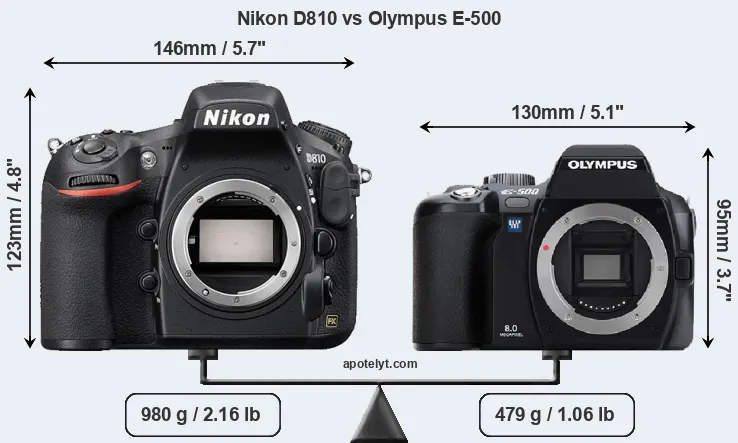 The side-by-side display below illustrates the physical size and weight of the Nikon D810 and the Olympus E-500. The two cameras are presented according to their relative size. Three successive views from the front, the top, and the rear are shown. All width, height and depth measures are rounded to the nearest millimeter.