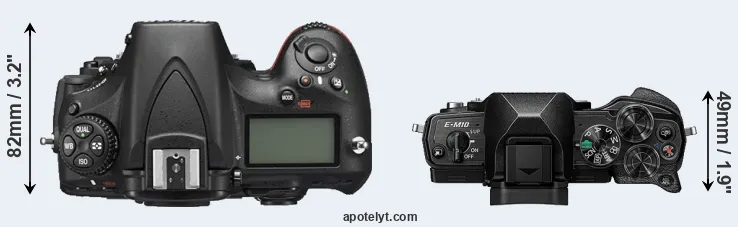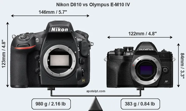 The physical size and weight of the Nikon D810 and the Olympus E-M10 IV are illustrated in the side-by-side display below. The two cameras are presented according to their relative size. Three consecutive views from the front, the top, and the rear side are shown. All size dimensions are rounded to the nearest millimeter.