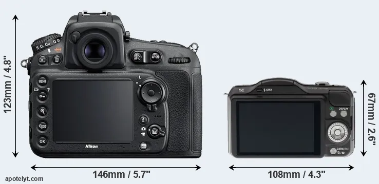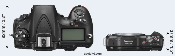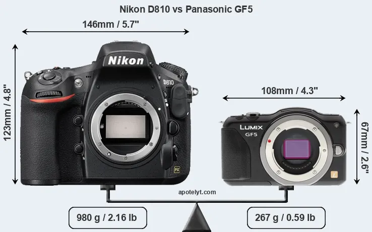 The side-by-side display below illustrates the physical size and weight of the Nikon D810 and the Panasonic GF5. The two cameras are presented according to their relative size. Three consecutive perspectives from the front, the top, and the back are available. All width, height and depth measures are rounded to the nearest millimeter.