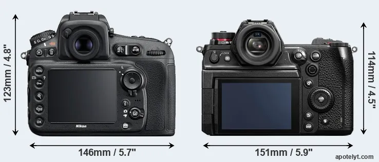 The physical size and weight of the Nikon D810 and the Panasonic S1H are illustrated in the side-by-side display below. The two cameras are presented according to their relative size. Three consecutive views from the front, the top, and the rear side are shown. All size dimensions are rounded to the nearest millimeter.