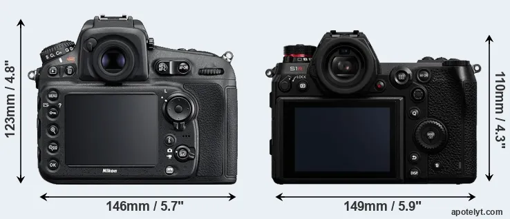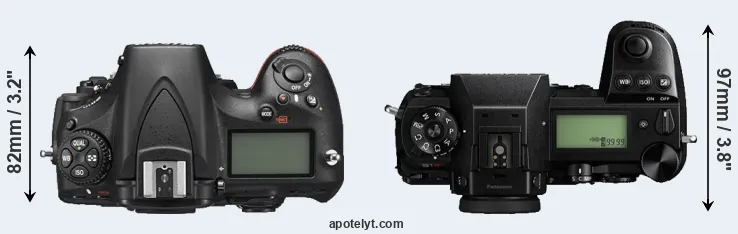 The side-by-side display below illustrates the physical size and weight of the Nikon D810 and the Panasonic S1R. The two cameras are presented according to their relative size. Three consecutive perspectives from the front, the top, and the back are available. All width, height and depth measures are rounded to the nearest millimeter.