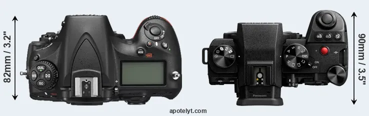 The physical size and weight of the Nikon D810 and the Panasonic S5 II are illustrated in the side-by-side display below. The two cameras are presented according to their relative size. Three consecutive perspectives from the front, the top, and the back are available. All width, height and depth measures are rounded to the nearest millimeter.