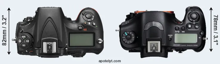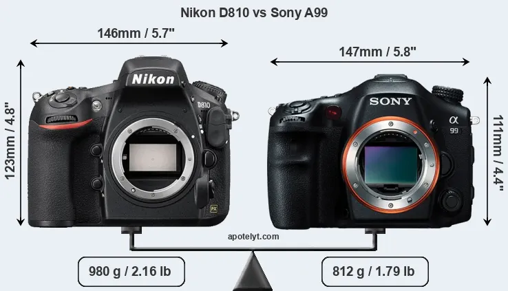 The side-by-side display below illustrates the physical size and weight of the Nikon D810 and the Sony A99. The two cameras are presented according to their relative size. Three consecutive perspectives from the front, the top, and the back are available. All width, height and depth measures are rounded to the nearest millimeter.