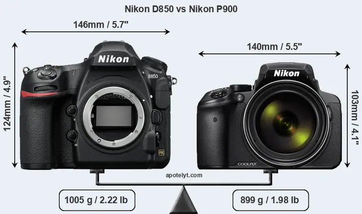 The physical size and weight of the Nikon D850 and the Nikon P900 are illustrated in the side-by-side display below. The two cameras are presented according to their relative size. Three successive views from the front, the top, and the rear are shown. All width, height and depth measures are rounded to the nearest millimeter.