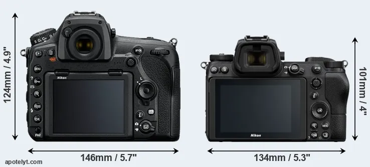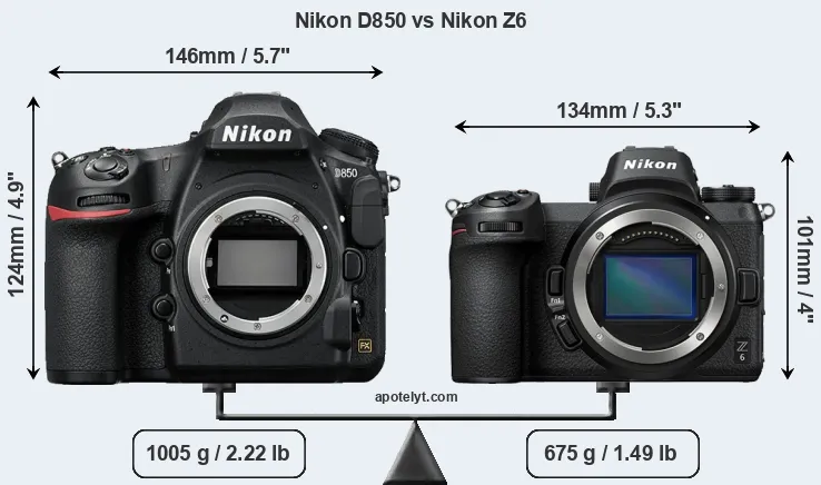 The physical size and weight of the Nikon D850 and the Nikon Z6 are illustrated in the side-by-side display below. The two cameras are presented according to their relative size. Three successive views from the front, the top, and the rear are shown. All width, height and depth measures are rounded to the nearest millimeter.