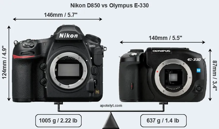 An illustration of the physical size and weight of the Nikon D850 and the Olympus E-330 is provided in the side-by-side display below. The two cameras are presented according to their relative size. Three successive views from the front, the top, and the rear are shown. All size dimensions are rounded to the nearest millimeter.