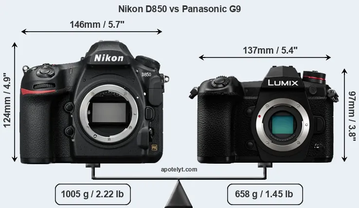 The physical size and weight of the Nikon D850 and the Panasonic G9 are illustrated in the side-by-side display below. The two cameras are presented according to their relative size. Three successive views from the front, the top, and the rear are shown. All width, height and depth measures are rounded to the nearest millimeter.