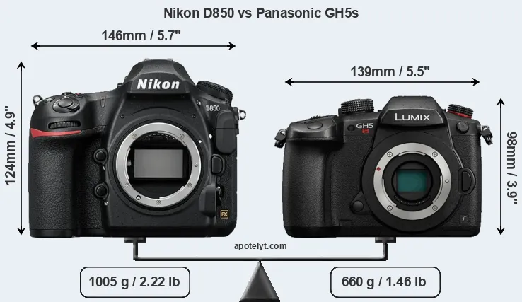 An illustration of the physical size and weight of the Nikon D850 and the Panasonic GH5s is provided in the side-by-side display below. The two cameras are presented according to their relative size. Three consecutive perspectives from the front, the top, and the back are available. All width, height and depth measures are rounded to the nearest millimeter.