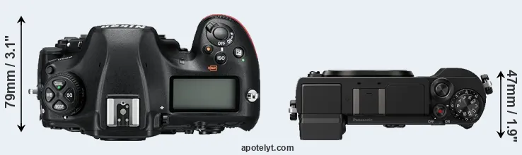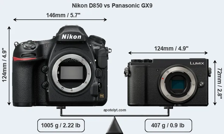 The physical size and weight of the Nikon D850 and the Panasonic GX9 are illustrated in the side-by-side display below. The two cameras are presented according to their relative size. Three consecutive perspectives from the front, the top, and the back are available. All width, height and depth dimensions are rounded to the nearest millimeter.